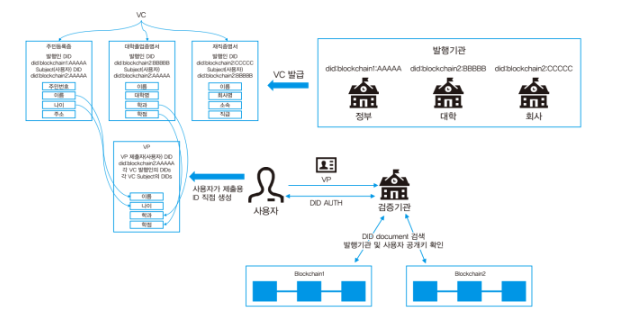 그리고 DID 및 ID 관련 정보를 저장하는 분산 저장소인 블록체인이 있다