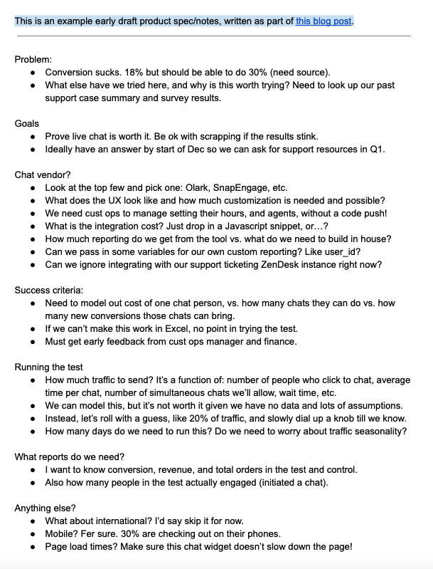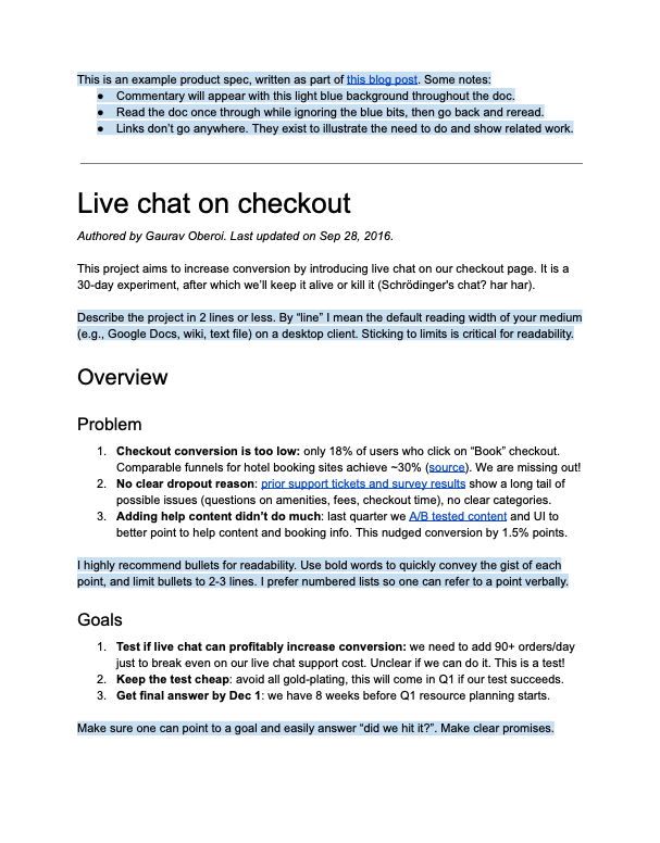 This is an example product spec, written as part of this blog post. Some notes: Commentary will appear with this light blue background throughout the doc. Read the doc once through while ignoring the blue bits, then go back and reread. Links don’t go any