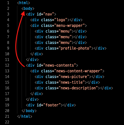 반대로 body 엘리먼트는 id가 news-contents div 엘리먼트의 부모 엘리먼트