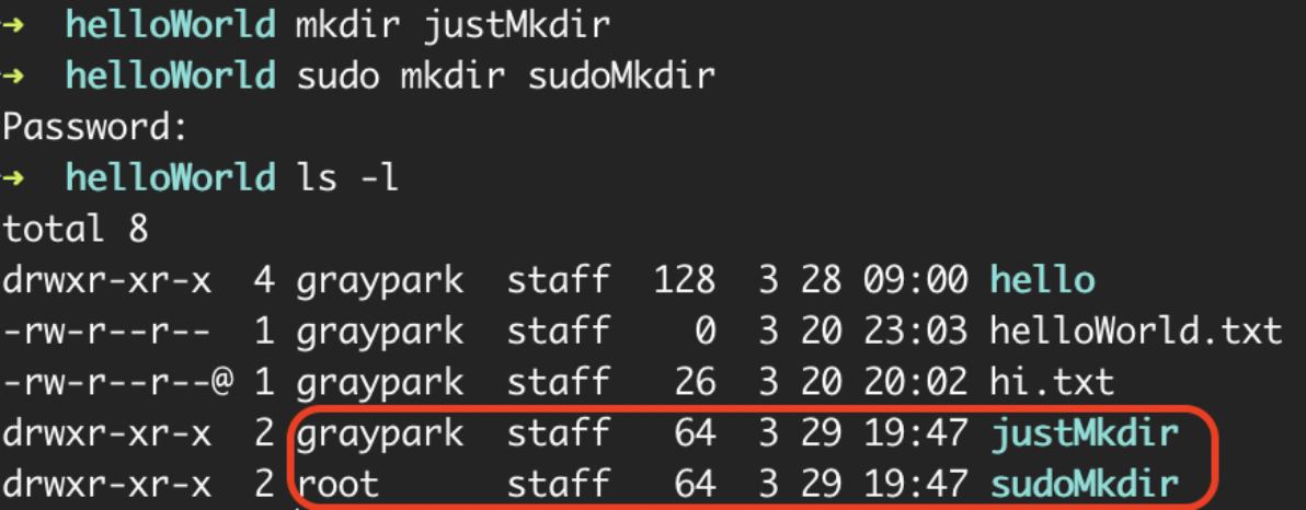 sudo 명령어와 mkdir 명령어를 함께 사용하여 관리자 소유의 폴더를 생성 # '#' 기호는 설명을 위해 사용하였습니다. mkdir justMkdir sudo mkdir sudoMkdir password: # 타이핑을 해도 출력이 없습니다. 비밀번호가 출력되지 않더라도, 입력이 정상적으로 이뤄지고 있습니다. ls # hello justMkdir sudoMkdir helloWorld.txt hi.txt